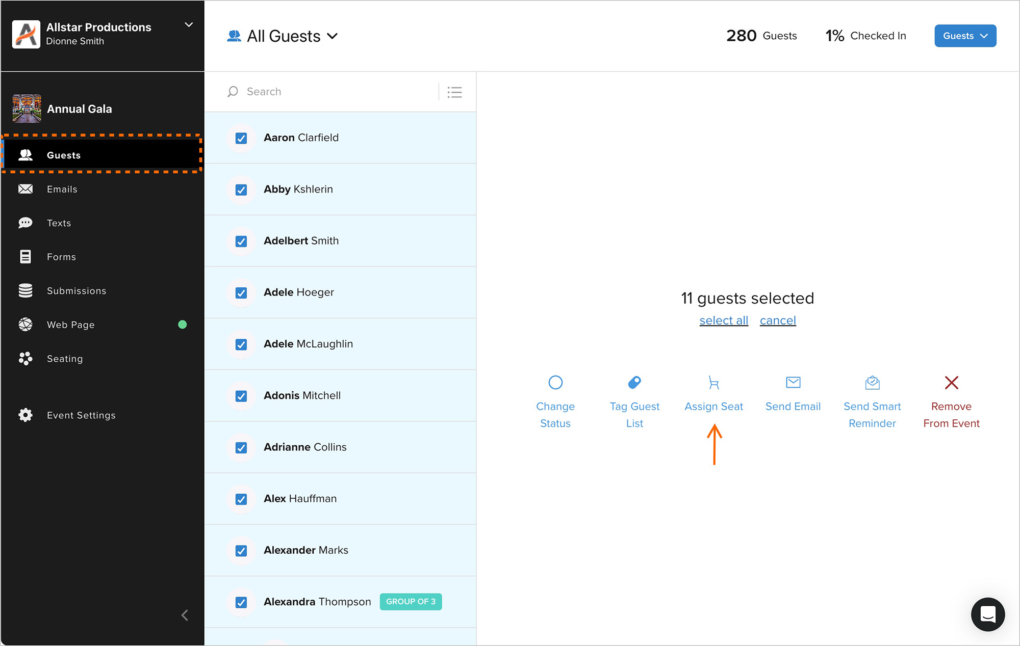 A new bulk Assign Seat option is available when multiple guests are selected. This feature assigns guests to a table and, if capacity is exceeded, automatically places the extra guests on that table’s waiting list. Additionally, a Randomize option is included to distribute selected guests across any available seats at all tables and rows.