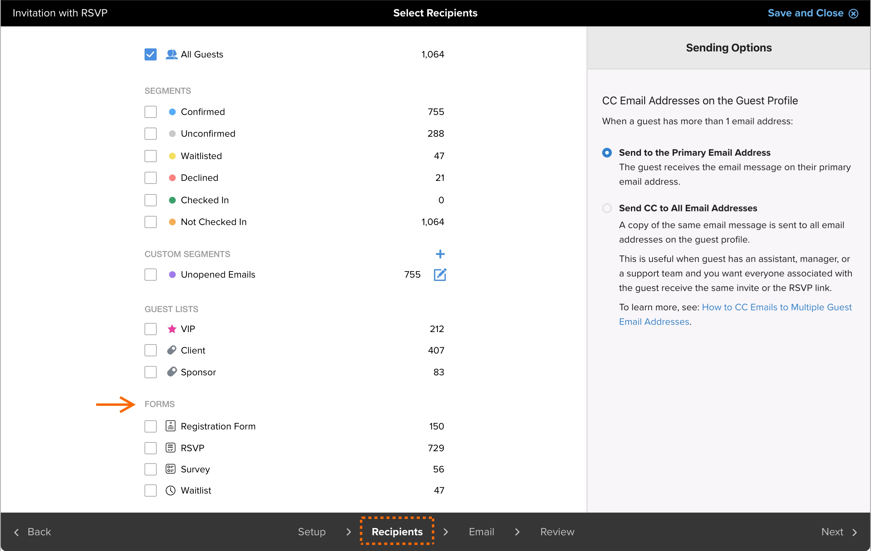 BackForm-Based Targeting for Email and SMS1756347103799 Improvement Emails and SMS messages can now be targeted to guests who submitted a specific form. A new form targeting option is available in the Recipients section of both Emails and Texts.